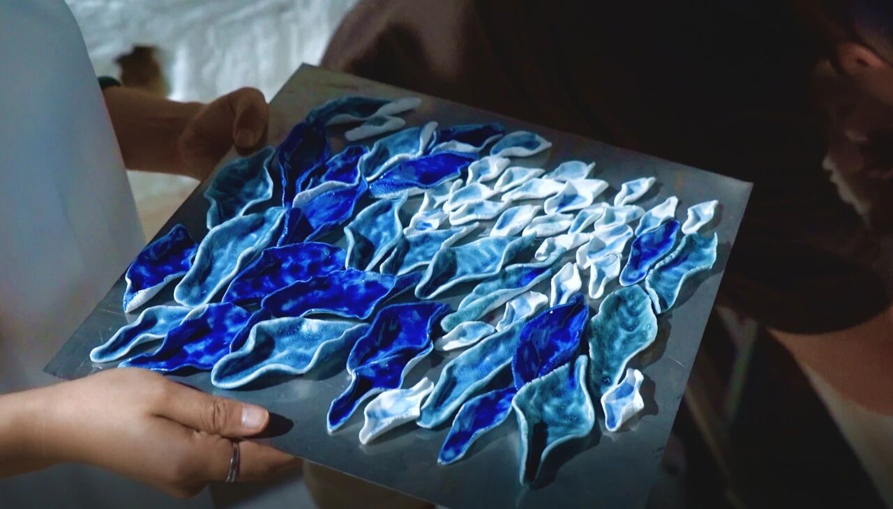 該工藝既保留了每片瓷獨(dú)特的手工質(zhì)感與肌理,又通過精密的結(jié)構(gòu)設(shè)計(jì),確保了整體形態(tài)的連貫與結(jié)構(gòu)的穩(wěn)固。從而使“青暉”在宏觀上呈現(xiàn)渾然一體的完整氣韻,在微觀處富含細(xì)膩生動的陶瓷語言,達(dá)成整體與局部的和諧統(tǒng)一。